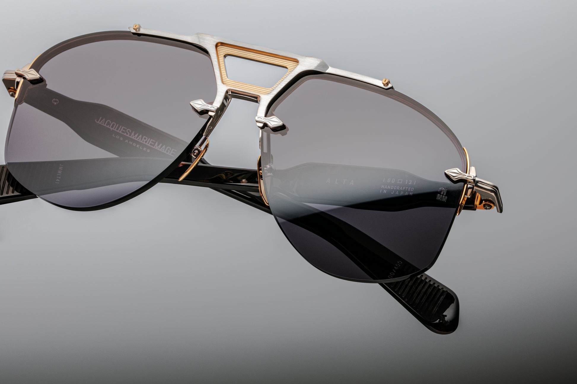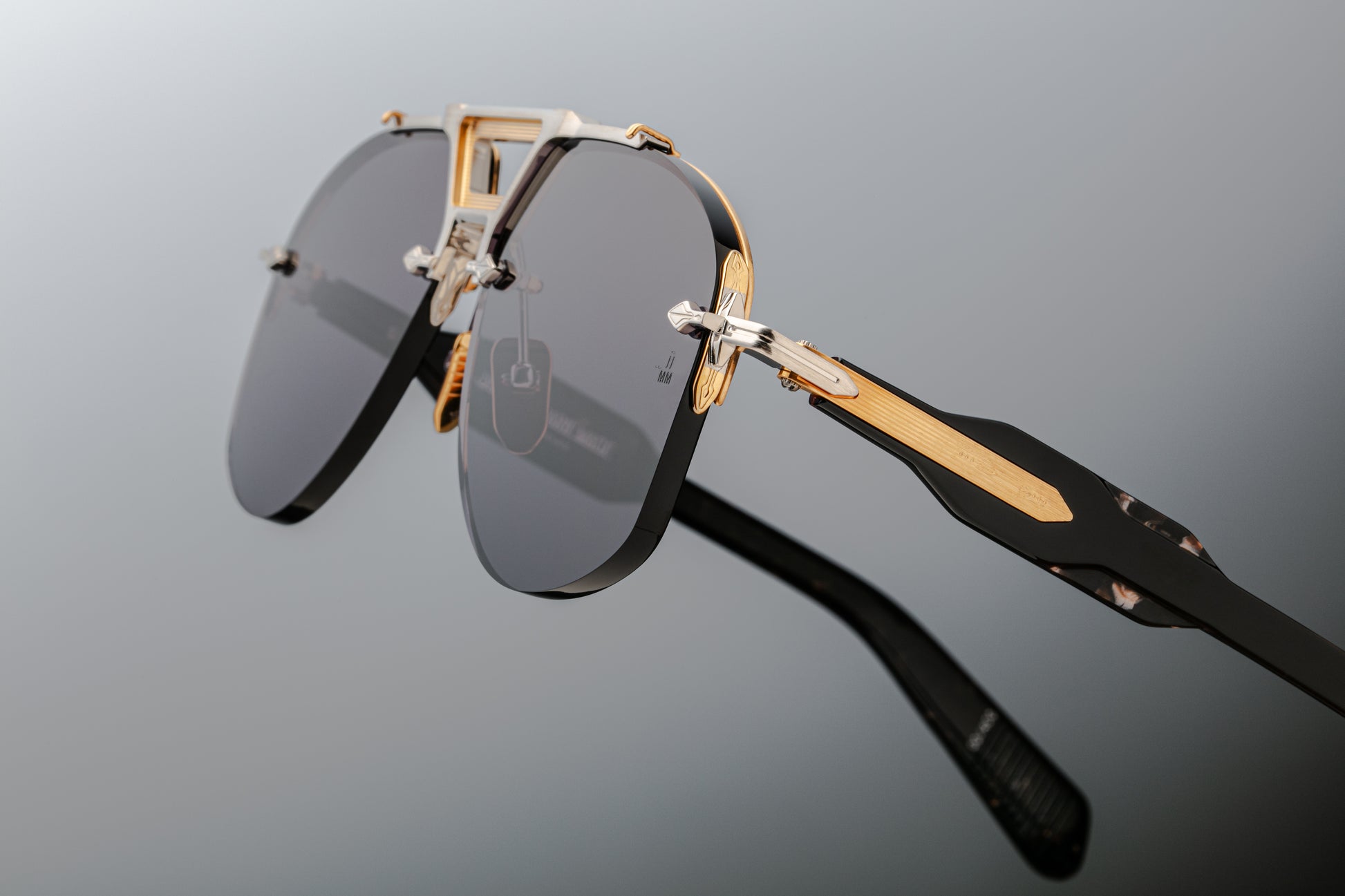 Montatura in argento 100% beta titanio con accenti oro scuro, aste in acetato di cellulosa polimerizzato nero e lenti grigie.