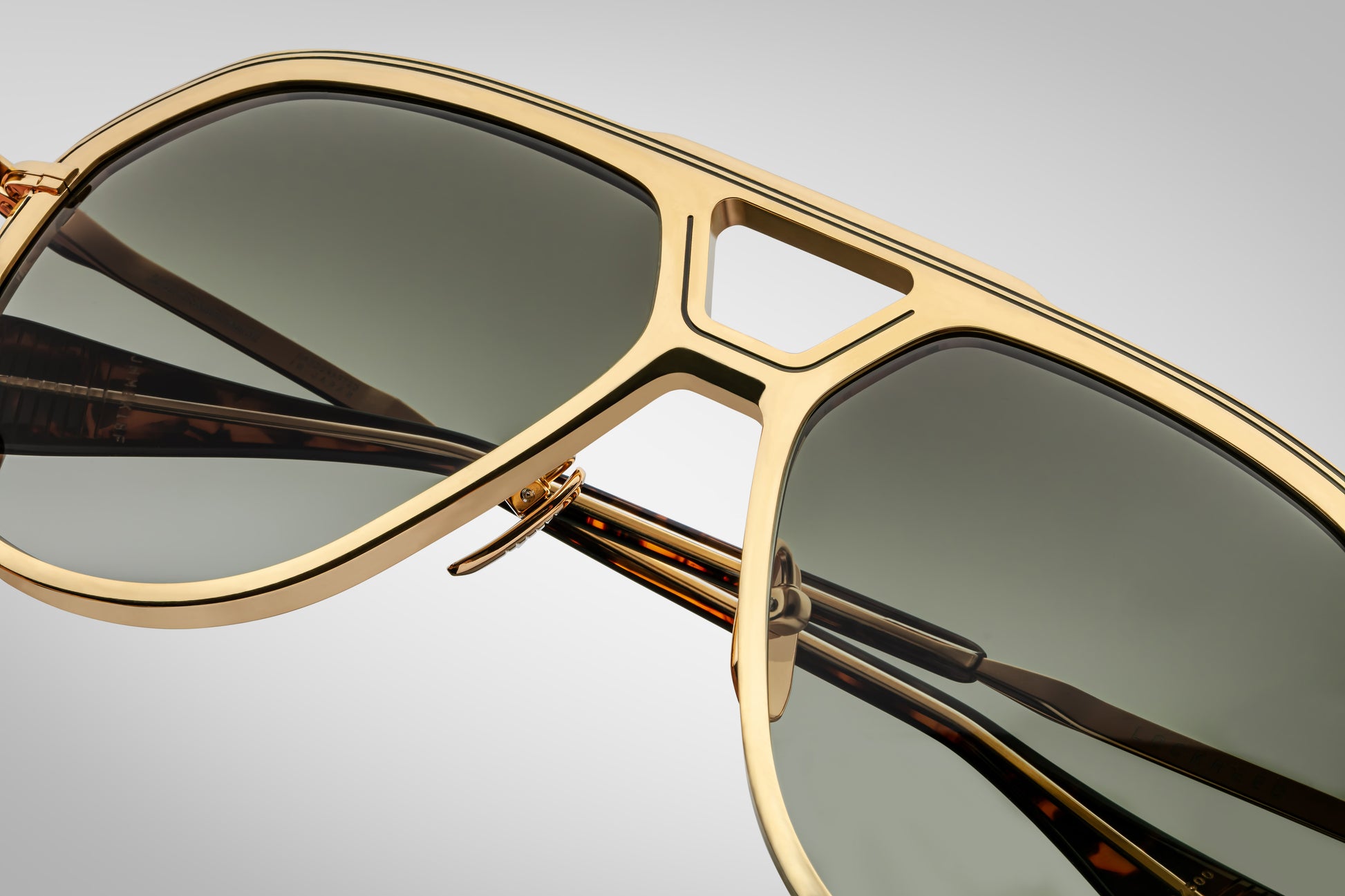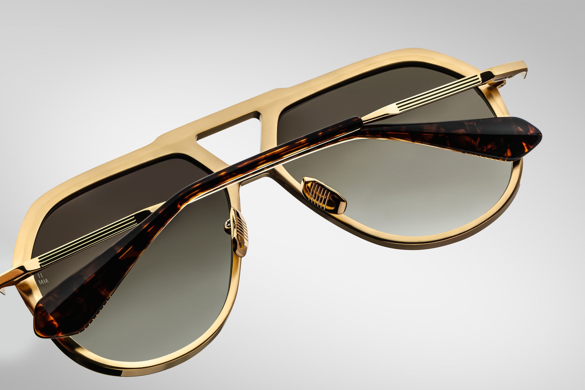 Aviatori classici, ispirati alla fine degli anni '70, in titanio con punte scultoree delle aste in acetato, caratterizzati da un profilo a forma di V, caratteristico doppio ponte e aste con abbellimenti bicolore e dettagli epossidici acconciati.
