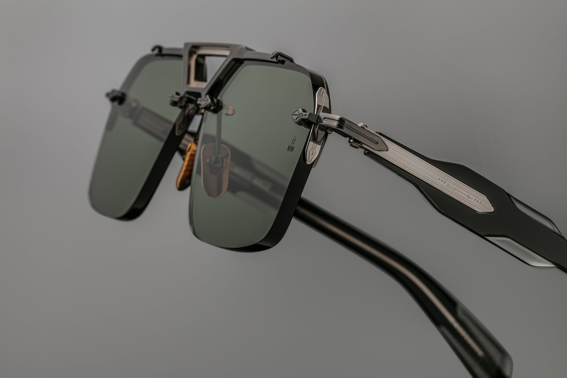 Una nuova straordinaria aggiunta alla serie Rimless, dotata di ponte naso e sopracciglio in titanio con dettagli bicolore e aste scultoree in acetato con abbellimenti wirecore.